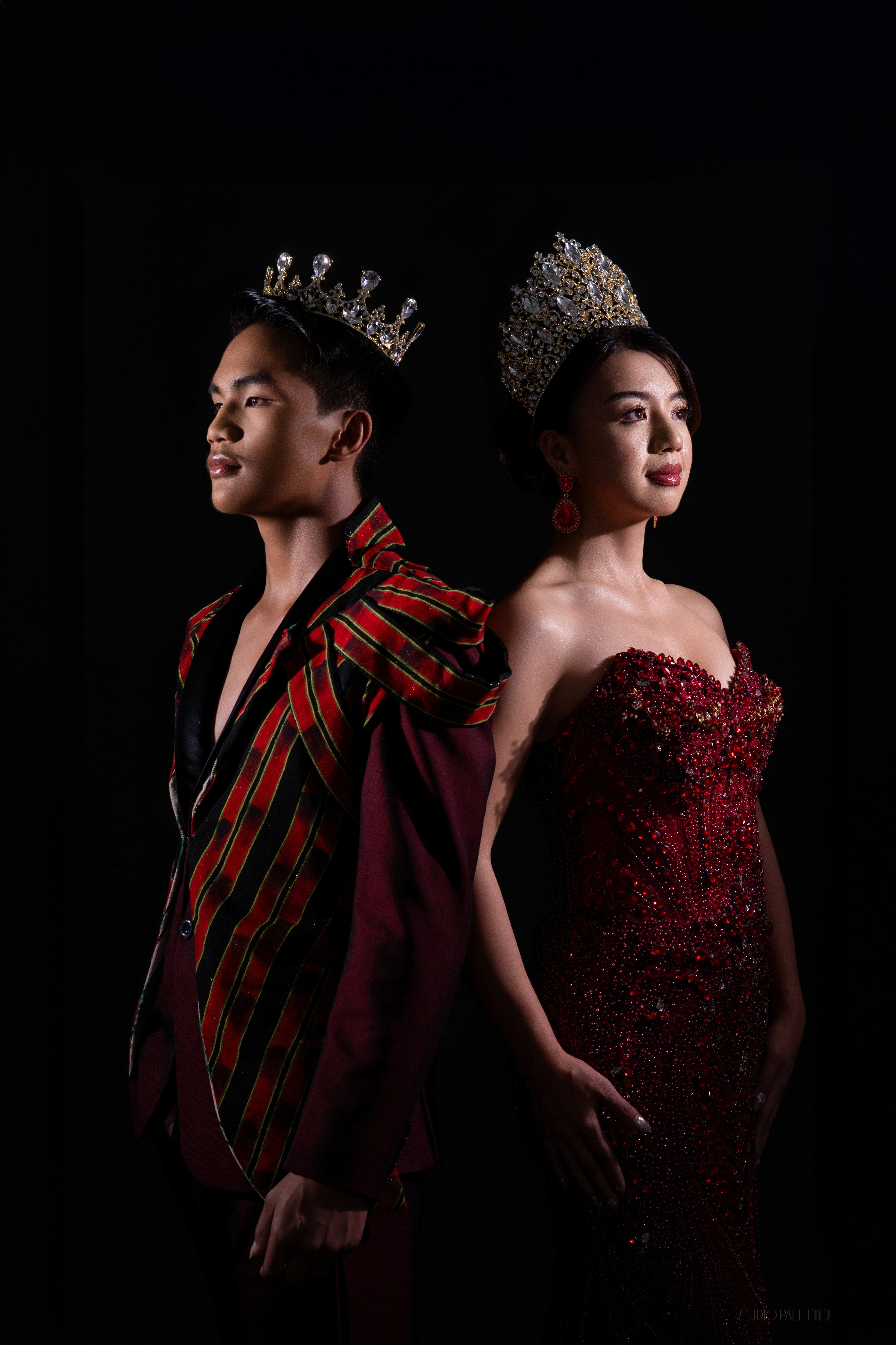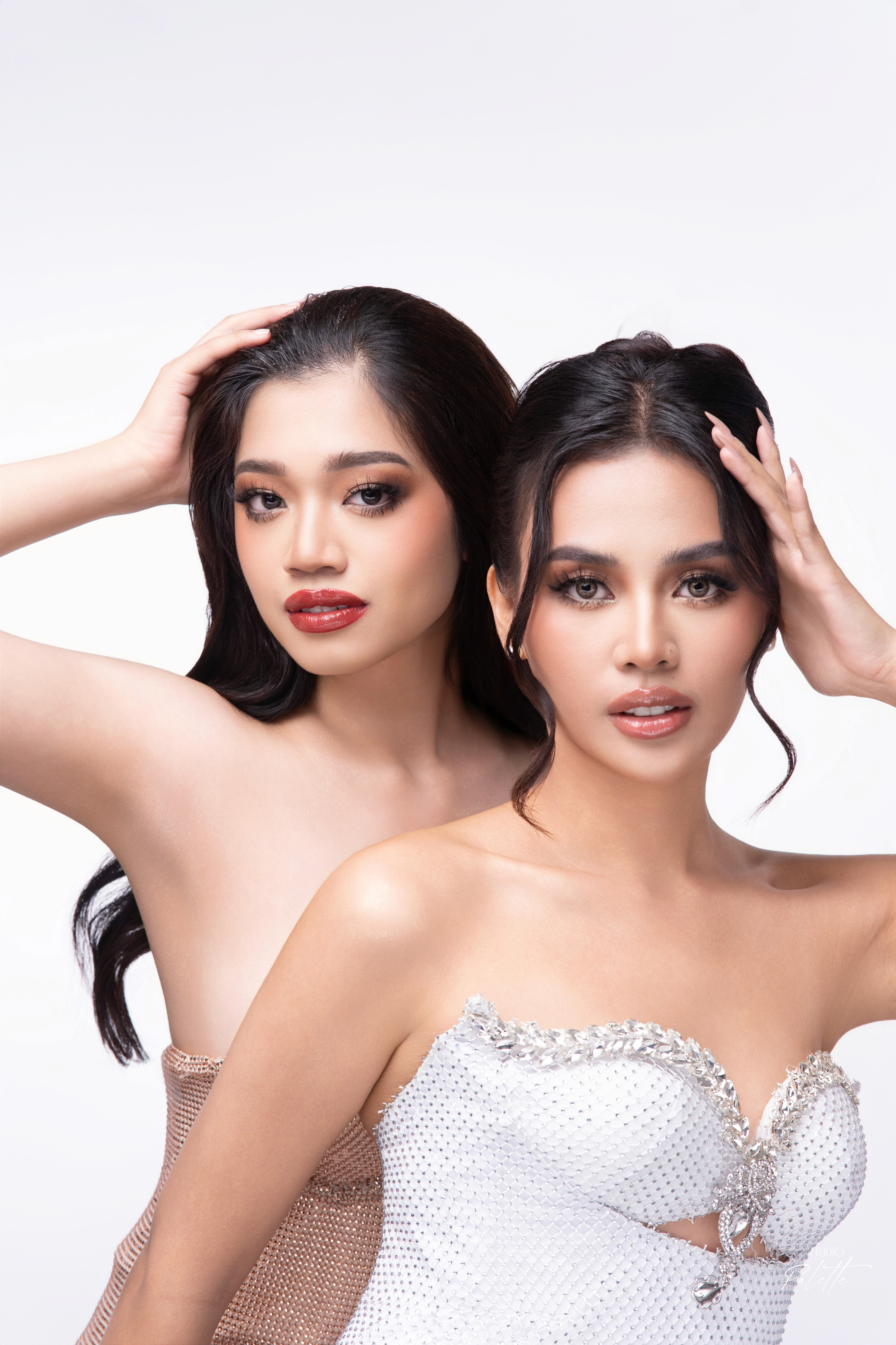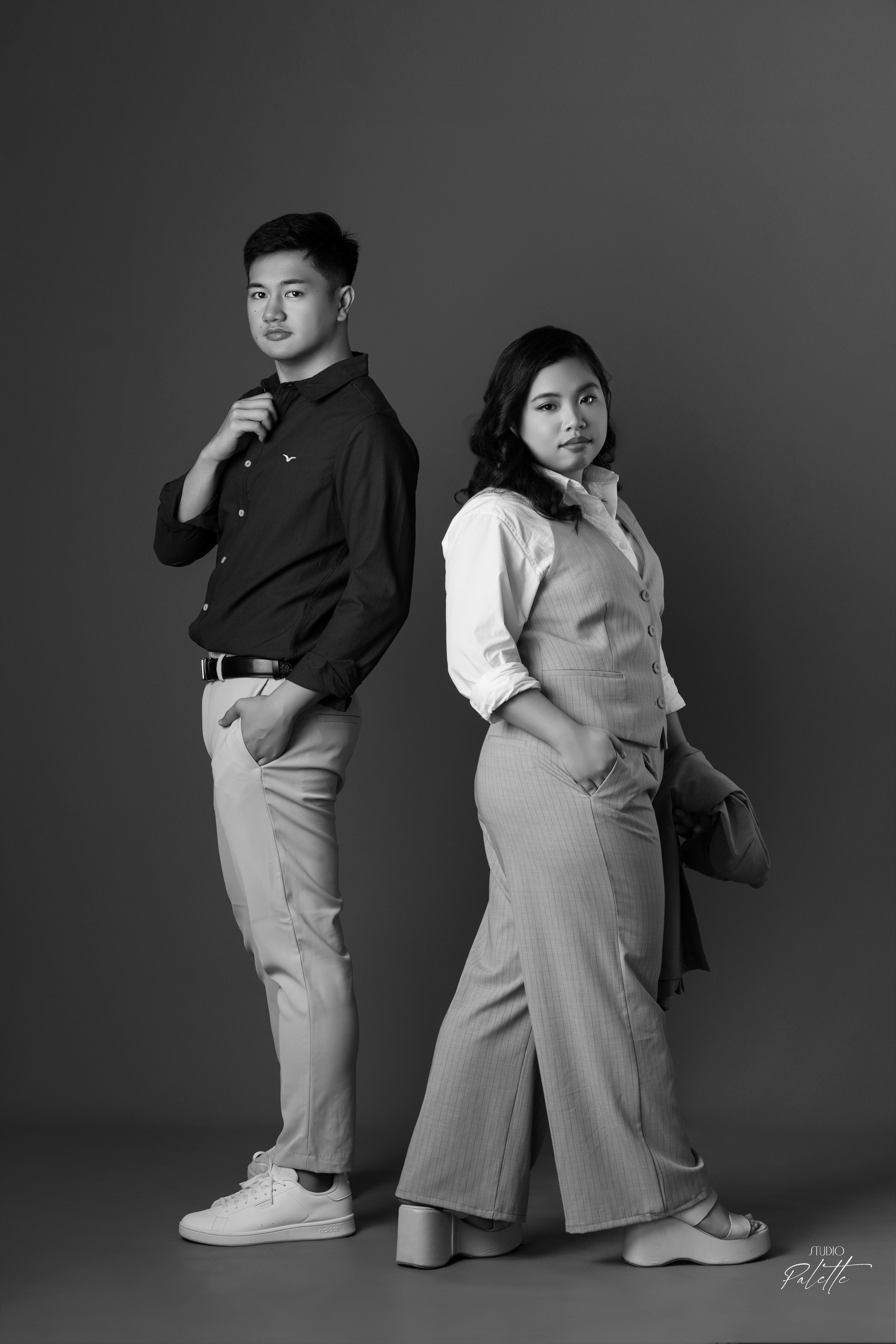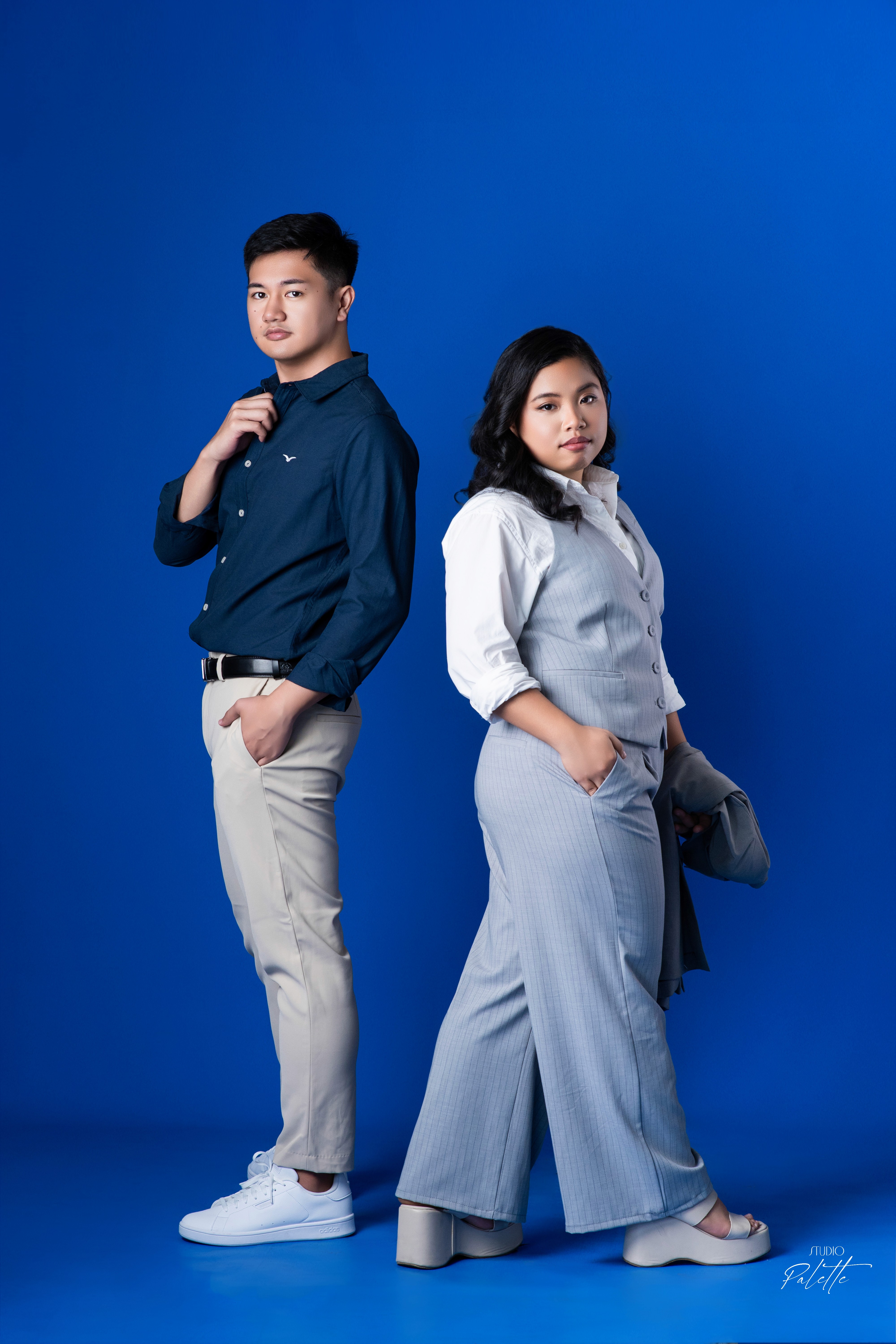 Duo(paired) shoots with minimalist backdrop and clean lighting.